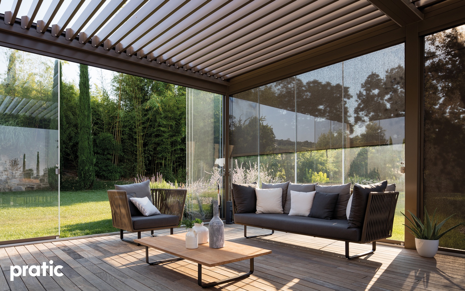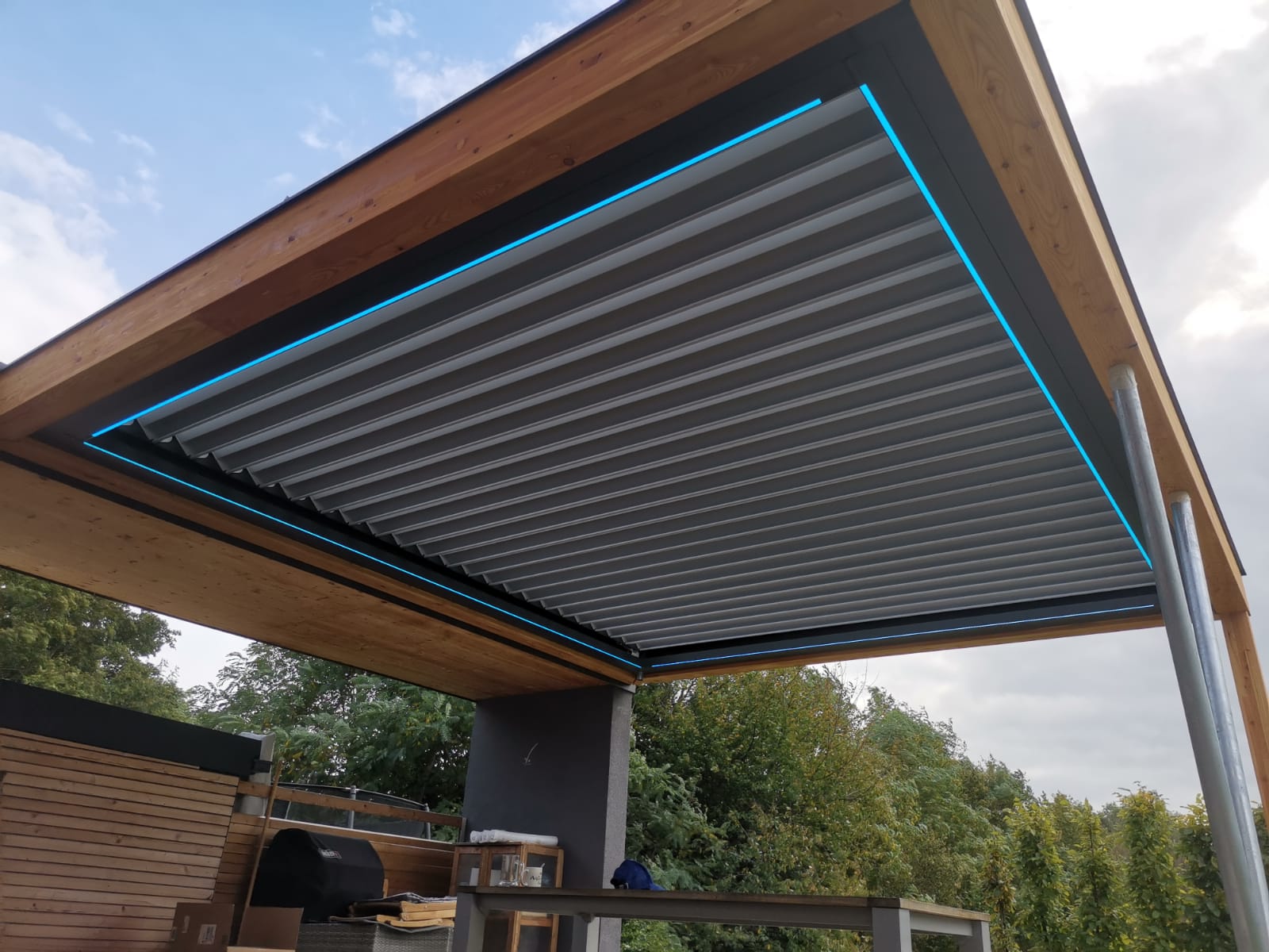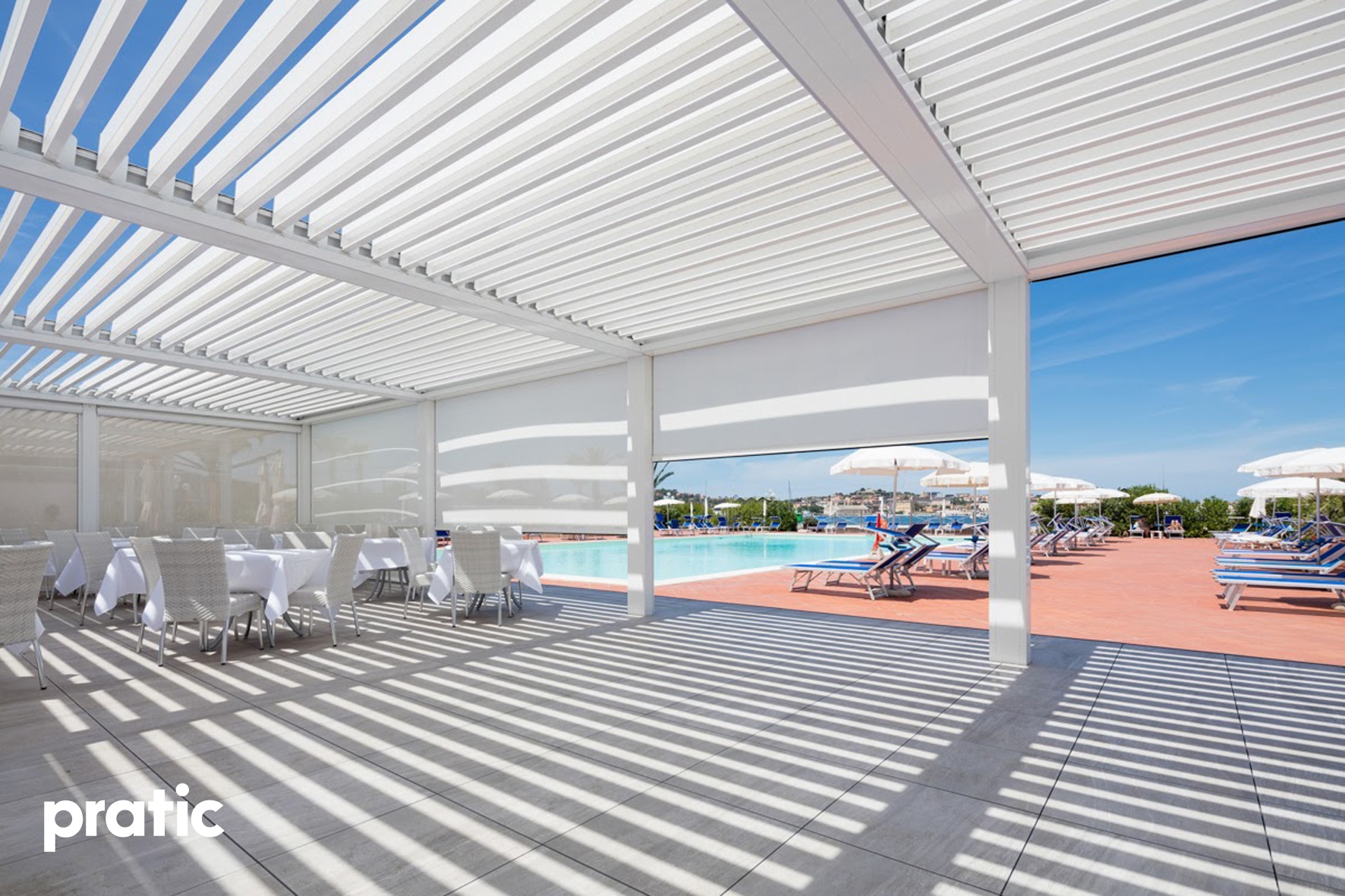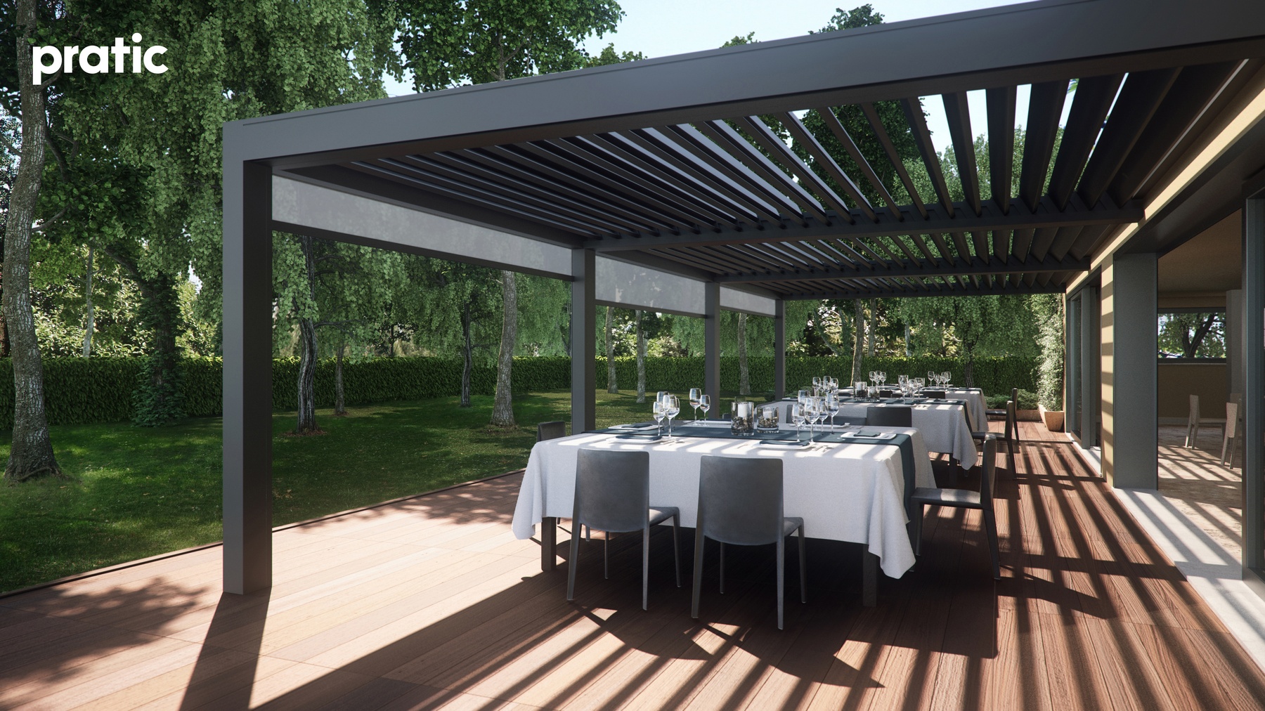 Modernes Design gepaart mit hoher Qualität- Lamellendächer aus Aluminium. Mit Lamellen, die bis zu 140° drehbar sind können Sie den Sonneneinfall und die Luftzufuhr selbst regulieren. Es dient nicht nur zur Erzeugung von Schatten, sondern ist auch ein zuverlässiger Regenschutz.